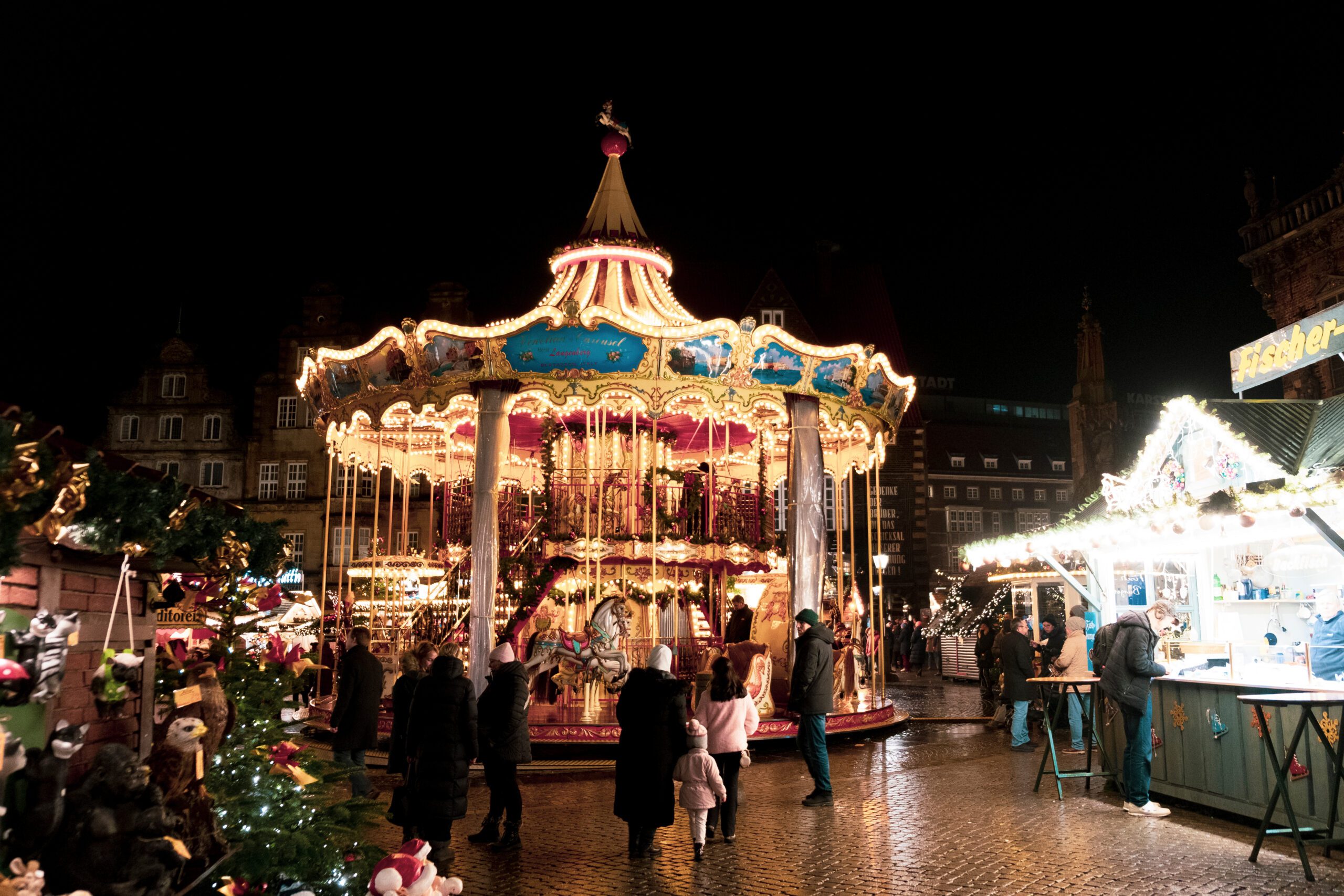 Allgemein » Auflagen entschlacken, Veranstalter entlasten und Feste retten! » The Old City of Bremen during the holidays season, Christmas market in Bremen, Die Sögestrasse, street of Bremen with light reflexion after the rain, people in Xmas Market