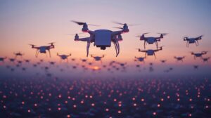 Allgemein » Wie gut ist der Bremer Flughafen gegen hybride Bedrohungen gesichert? » Fleet of Drones Flying at Sunset with Illuminated Lights Below Ideal for Technology and Innova
